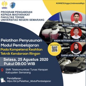 Sebanyak lima orang guru, satu teknisi dan satulaboran otomotif SMK Telekomunikasi Tunas Harapan (SMK TTH) mengikuti kegiatan pelatihanpenyusunan modul pembelajaran denganmengundang nara sumber dari salah satuUniversitas pasangan yaitu Universitas negeriSemarang (UNNES).